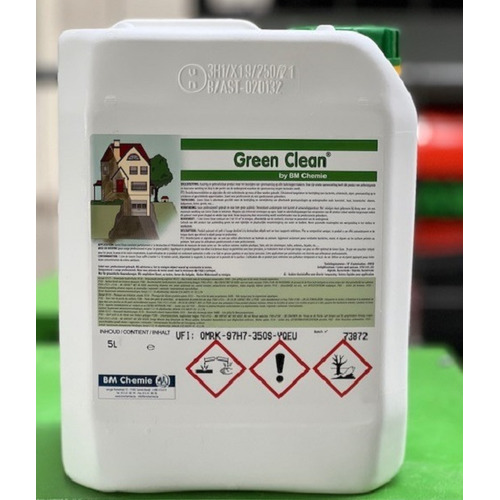 Green Clean élimine la mousse, les dépôts verts, les algues et les champignons de manière durable et efficace. Le dissolvant de mousse incolore détruit la mousse jusqu'à la racine, ce qui la rend moins susceptible de repousser. L'effet autonettoyant de Green Clean garantit que les dépôts verts sont éliminés sans frotter. Vous pouvez utiliser Green Clean sur l'asphalte, la pierre, la toiture, le verre, pour les terrasses, les allées et les meubles de jardin. À l'aide d'un pulvérisateur dorsal ou d'un nettoyeur haute pression, étalez le produit dilué uniformément sur la surface à nettoyer. Laissez agir quelques instants et rincez à l'eau claire. En cas de dépôts importants, utilisez la ponceuse avec réservoir de liquide pour un nettoyage approfondi entre les deux. Vous pouvez acheter Green Clean dans n'importe quelle filiale Huurland.