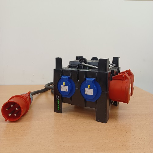 Cube permettant de distribuer l'électricité : 32 A non convertible 220 V - 380 V alimentation 32 A - 5 broches 1 * diff. 4 P - 40 A - 0,3 sortie réseau principal : 2 * 5 broches - 32 A sortie réseau domestique : 3 * prise domestique avec broche de terre - 16 A Installations électriques temporaires doivent être certifiées après montage par un organisme agréé. Il convient de vérifier la tension des prises de courant avant d'alimenter les utilisateurs finaux.