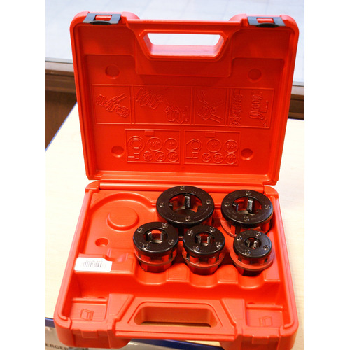 Têtes de filière pour filetage manuel ou électrique : set dans coffret : 3/8" - 1/2" - 3/4" - 1" - 1.1/4" cliquet inclus
