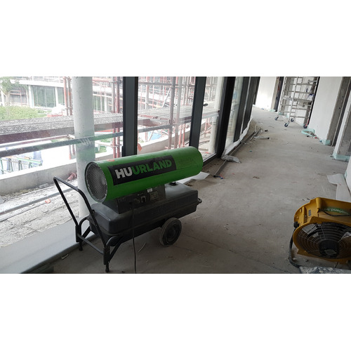 Huur een compacte warmeluchtblazer op stookolie. Dit warmtekanon kan je huren voor de verwarming van werkplaatsen en werkhallen. Capaciteit tot 600-750 m³. Toestellen zijn niet uitgerust met een gescheiden rookgasafvoer, er moet voldoende geventileerd worden. Deze warmeluchtblazer is voorzien van een ingbouwde dagtank. specificaties: (zonder schouw) netto kapaciteit 46,5 kW (40000 Kcal) 220 V - 1,8 A verbruik: 4,2 l/u luchtdebiet: 1100 m³/u tankinhoud: 80 l CO-productie: 0 ppm CO2-productie: 10-12% DGWK keuringsnr.: 1863