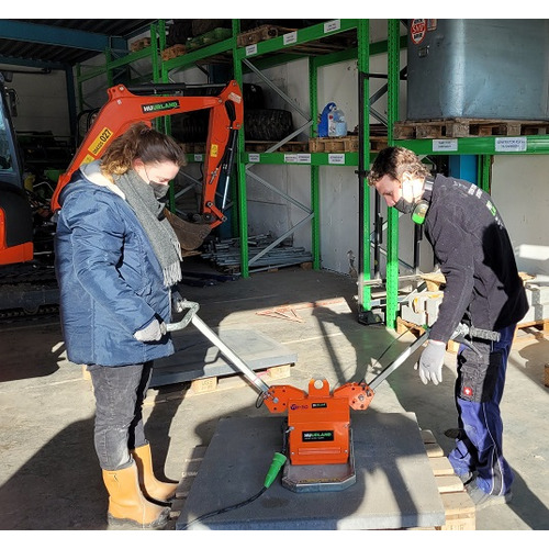Handig toestel om met 2 personen of met kraan bestrating op te tillen. Geschikt voor betonsteen, natuursteen, keramische materialen, ... 220 V incl. 2 handvaten vacuumpomp 150 L/min max. hefvermogen 135 kg voorzien van hefoog voor kraan
