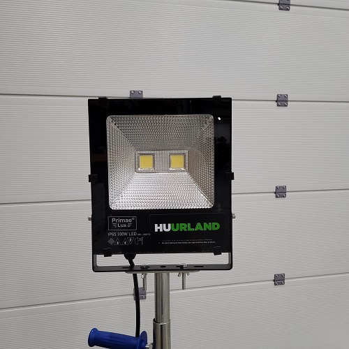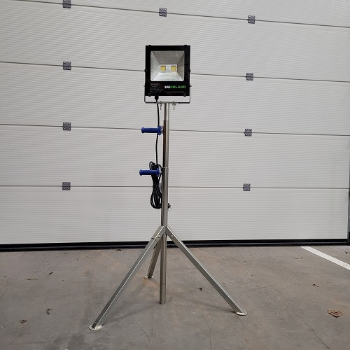 Tijdelijke verlichting. Handige lichtspot met statief als tijdelijke lichtbron op werven of evenementen. Klasse 2 werflicht, HQI lamp 150 W, 5 meter kabel 2x1mm², geïoleerde draagbeugel